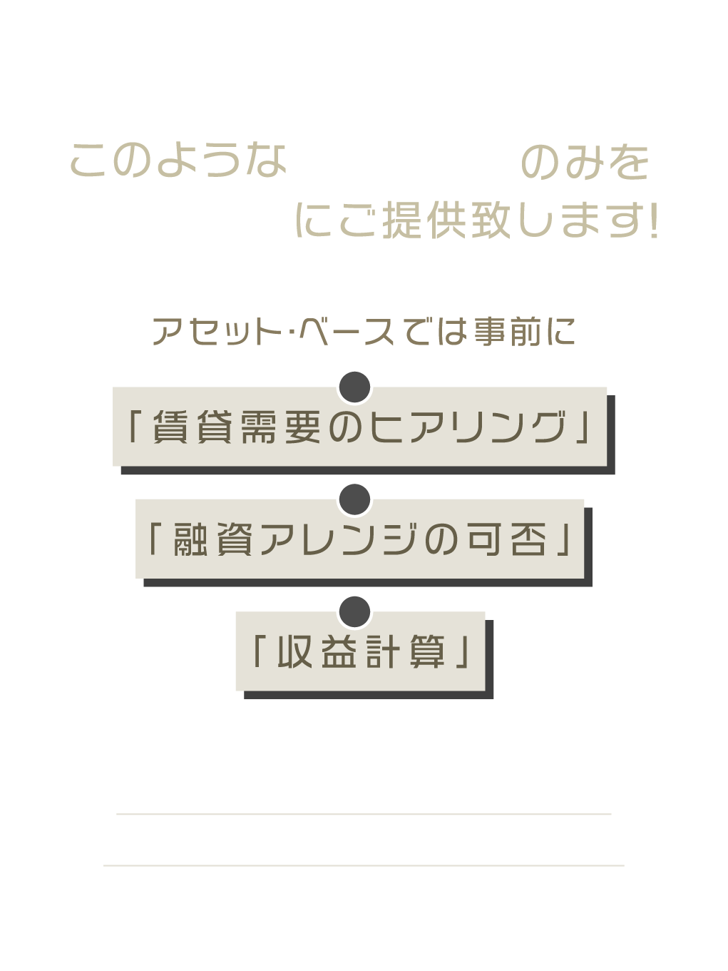 不動産業界で長年培ったアセット・ベース独自のネットワークによる優良投資物件情報をお客様にご提供します。
